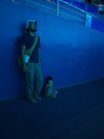 一面が大きな大きな水槽でジンベイザメやマンタがすいすい泳ぐ姿に