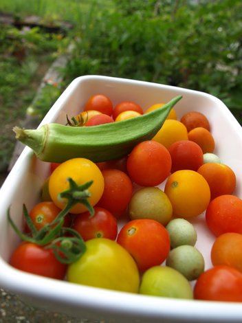 赤く色んだトマトを収穫するために小さな畑を見回すと
